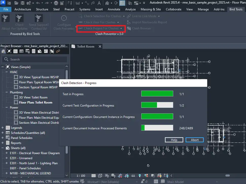 Starting with version 5.0, Bird Tools - Clash Preventor introduces an exclusive functionality that sets it apart from other Revit plugins - the ability to run Revit commands asynchronously in the background without freezing the main app's interface. This means that all manual clash detection modes and the real-time mode can now run in the background, allowing users to run clash detection tests while they continue editing the model without any performance degradation. This asynchronous clash detection capability brings clash prevention into the 21st century, enhancing user productivity and workflow efficiency.