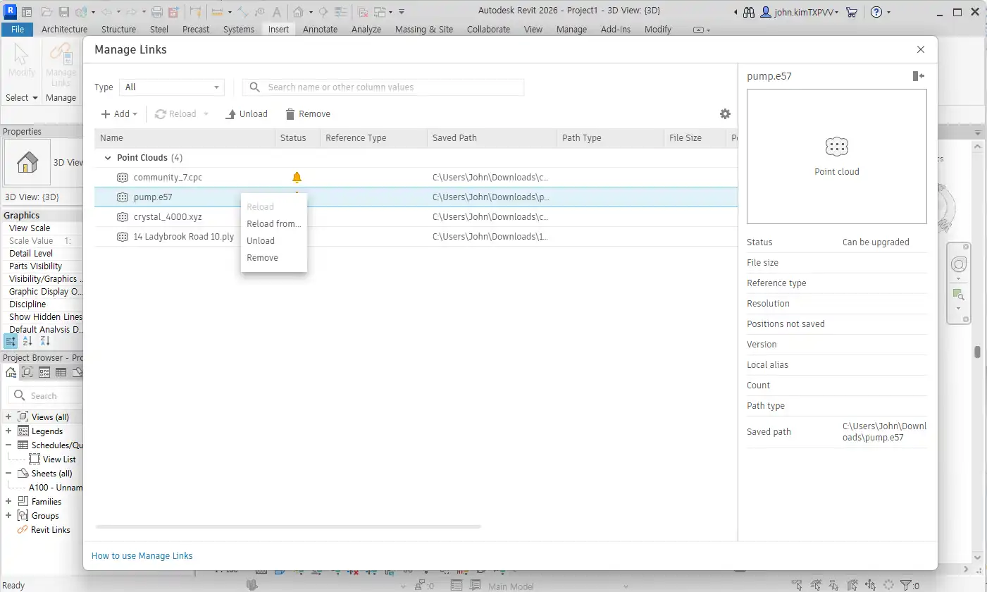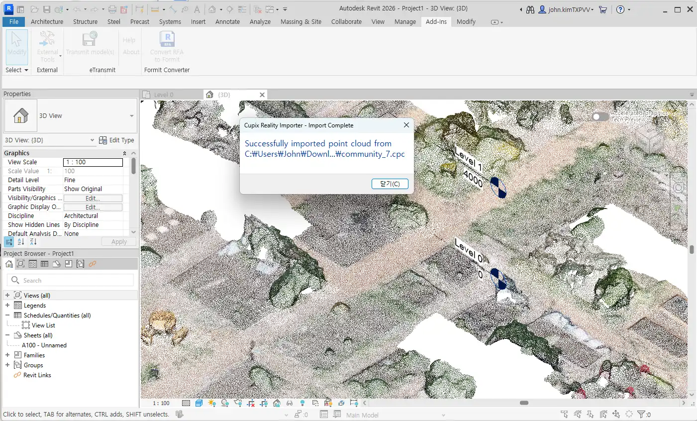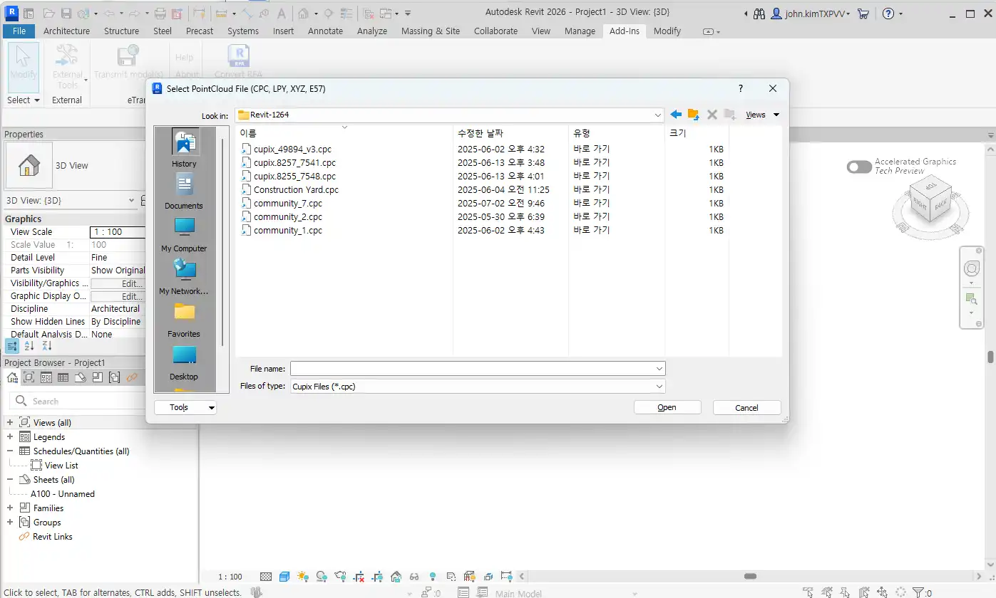 The Cupix Reality Importer supports a variety of file formats including PLY, XYZ, E57, and the proprietary Cupix Point Cloud format (CPC). It imports both coordinate data and color attributes when present, ensuring that your point cloud data is accurately represented in Revit. Additionally, the point cloud's origin is positioned at Revit's internal origin, making it easy to work with and manipulate within the software.