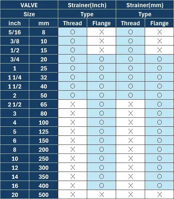 - Flange-type and threaded-type strainer families in millimeter units