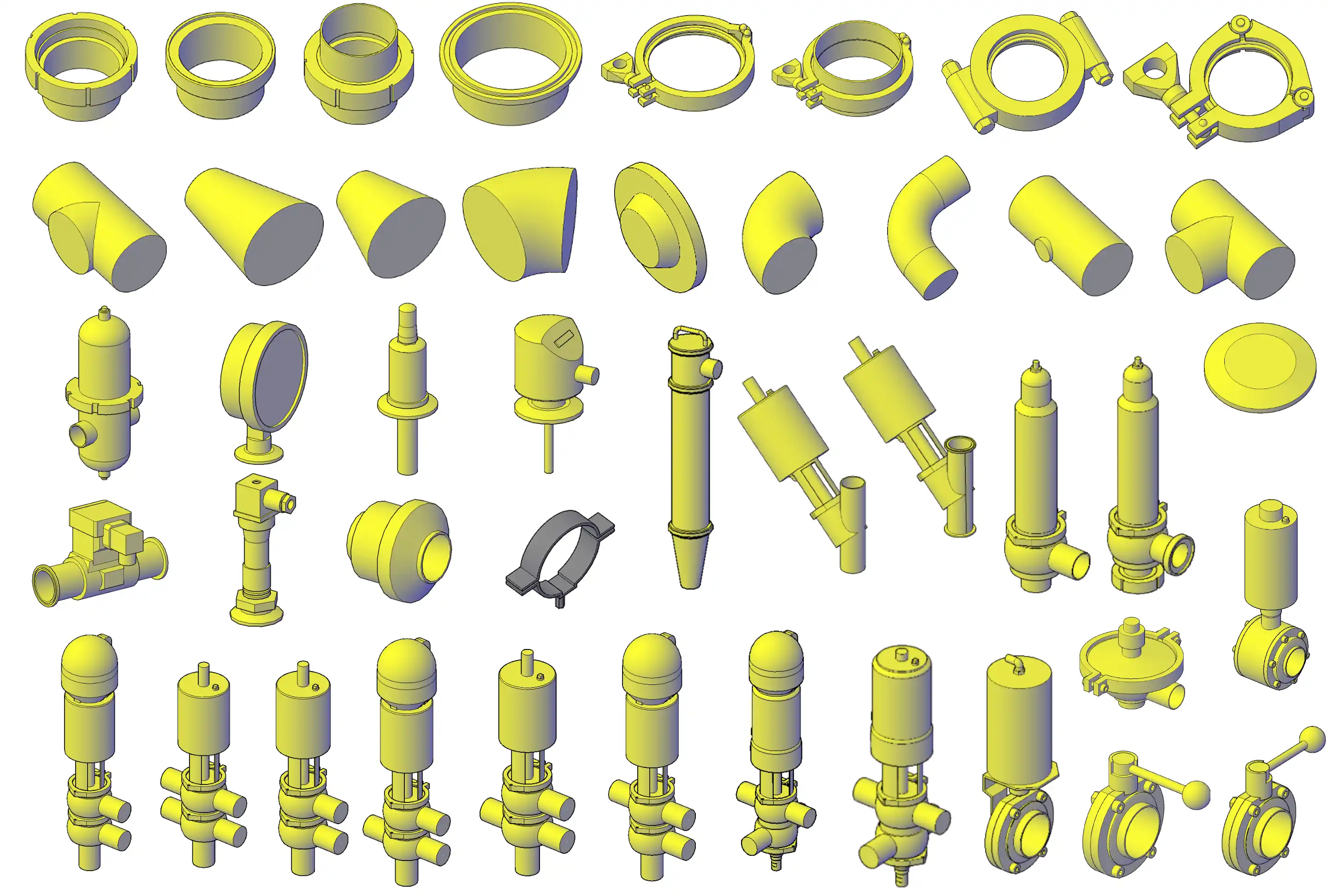 In addition to standard pipes and fittings, the plugin also includes a variety of specialty components such as elbows, tees, reducers, caps, clamps, couplings, flanges, gaskets, instruments, strainers, and valves. The wide selection of valves, including butterfly, ball, check, shutoff, change-over, mix proof, diaphragm, regulating, and safety valves, provides users with the flexibility to design complex piping systems with ease.
