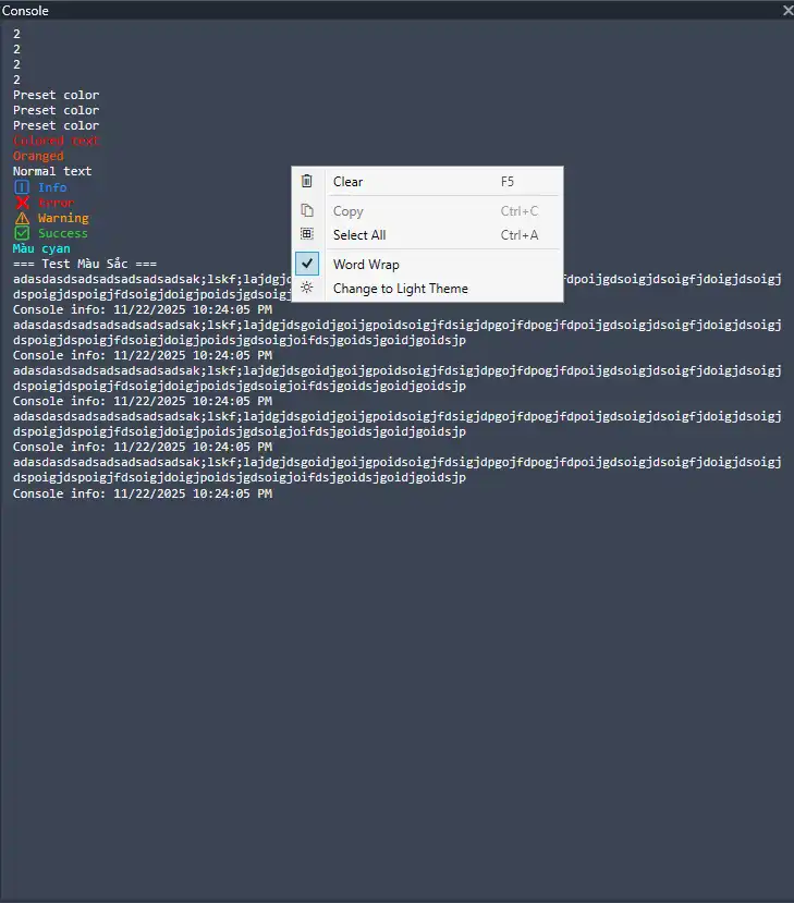 The built-in context menu of ConsoleApp includes essential functions such as "Clear", "Copy", and "Select All", making log management a breeze. Users can easily manage their log output with just a few clicks, improving efficiency and productivity during the debugging process.