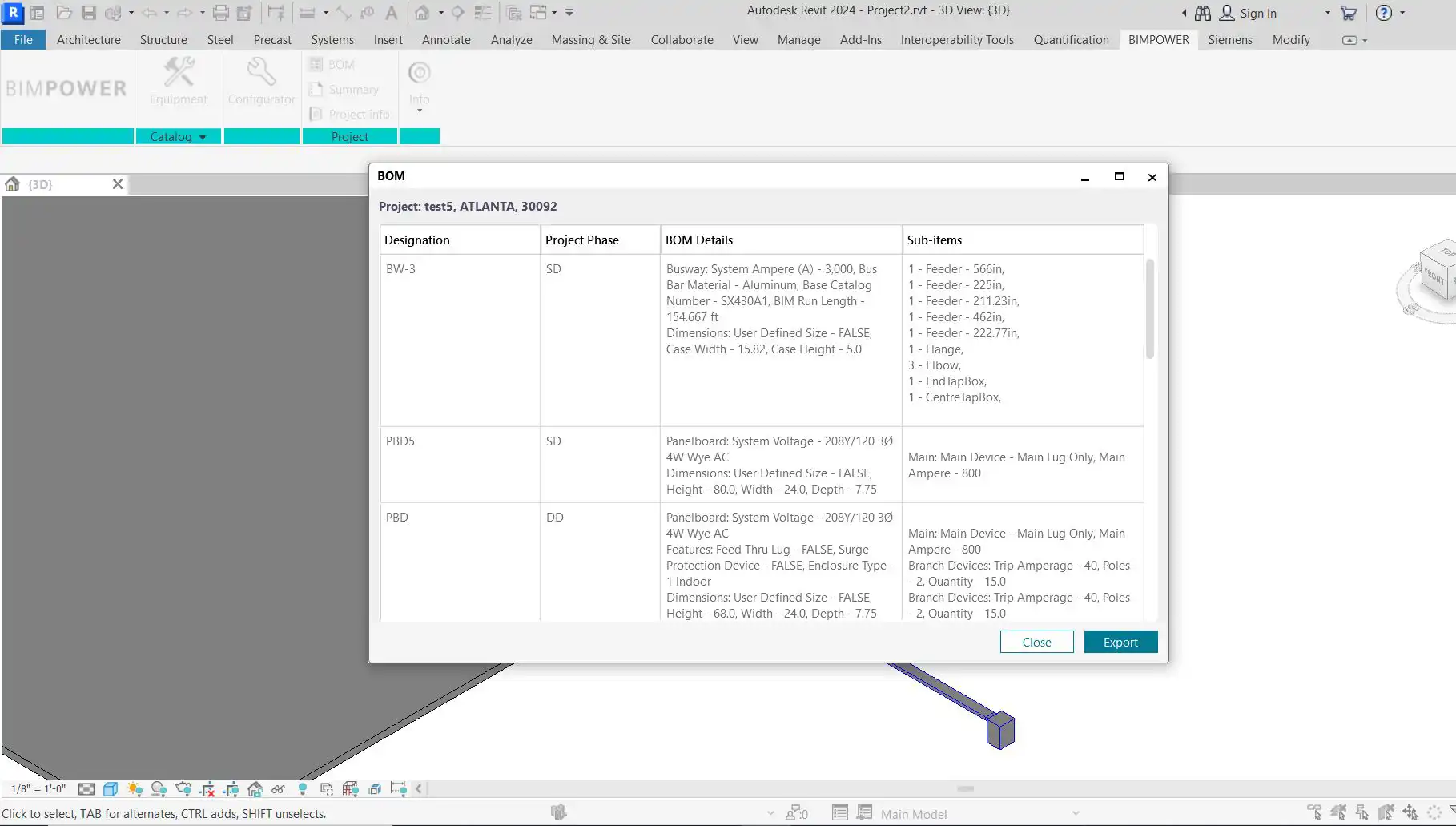 Furthermore, BIMPOWER generates electrical equipment models specific to each configuration, providing design feedback in real-time. This not only saves time but also ensures that the final design is accurate and meets project requirements. The plugin also tracks the Bill of Materials (BOM) for the entire project, allowing designers to download and share it with project stakeholders or export it directly to Siemens' quotation platform (COMPAS).