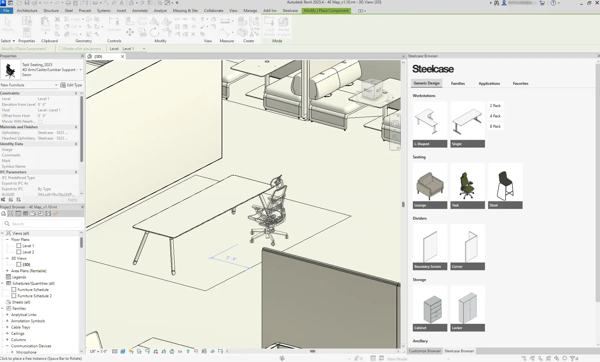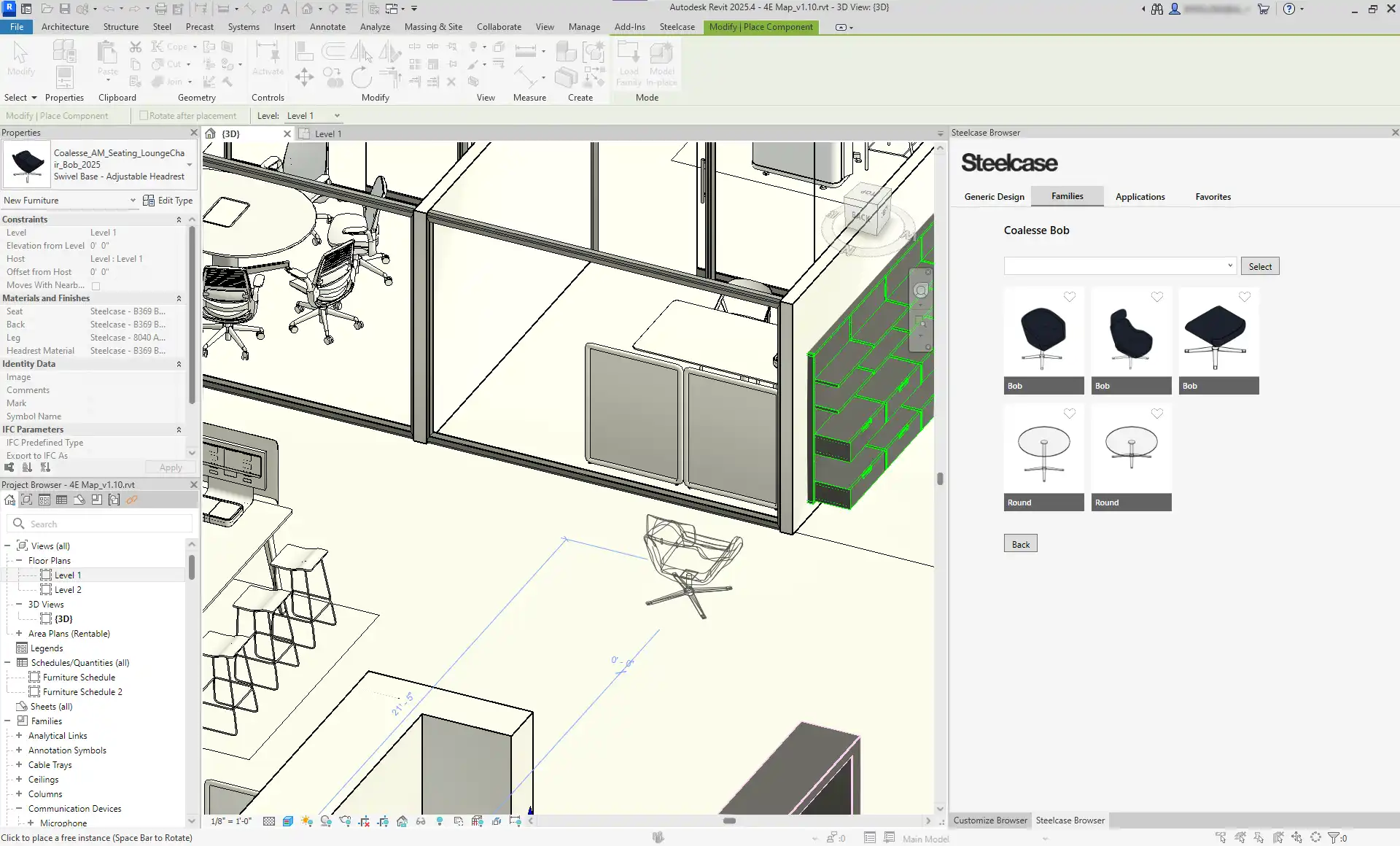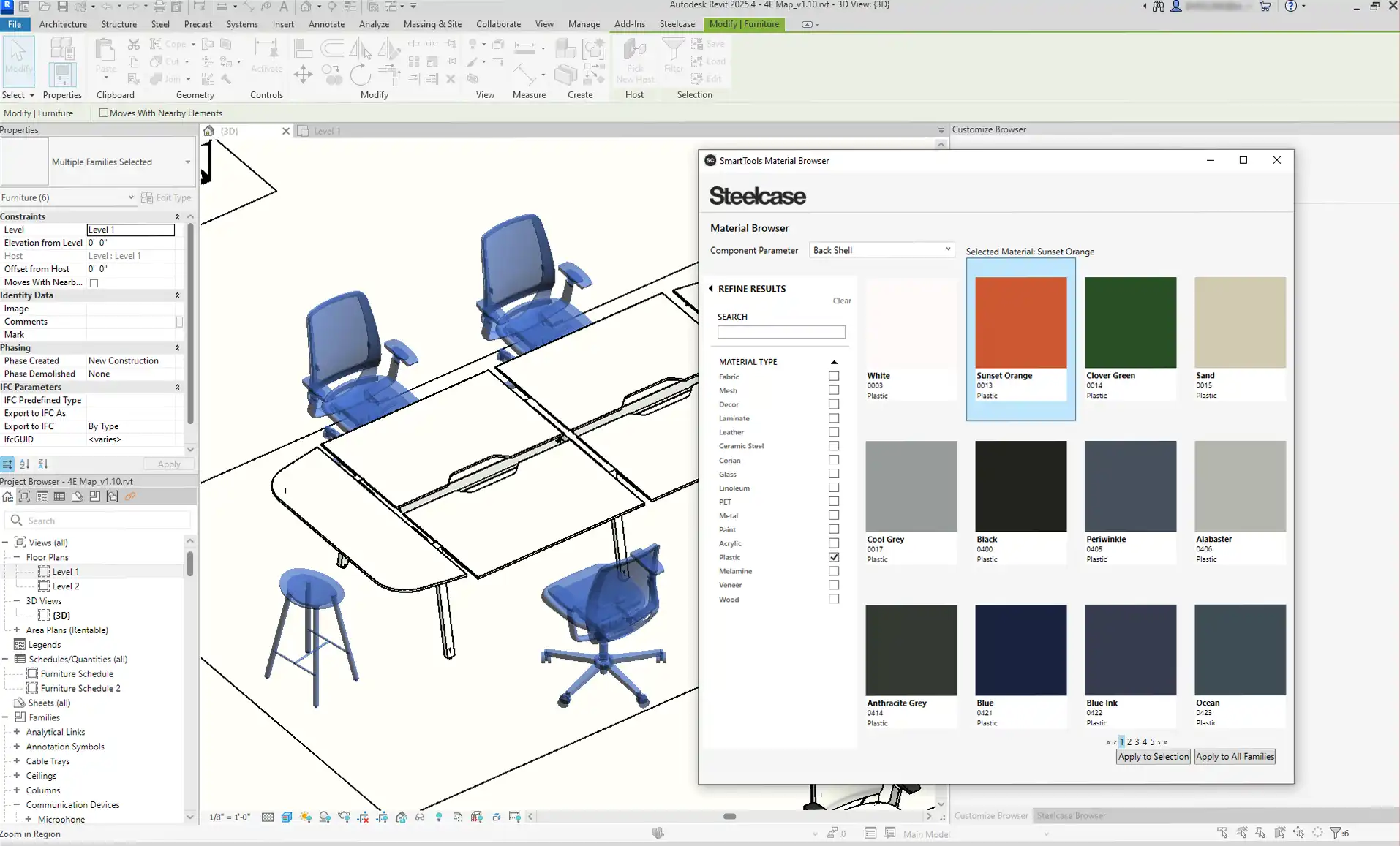 Once installed, the plugin seamlessly integrates into Autodesk® Revit®, making the library easily accessible within the software. Planning ideas available on Steelcase.com can be directly placed into your model with one click, allowing for quick experimentation and iteration. The ability to customize families with a comprehensive material library adds a layer of detail and customization to your designs.