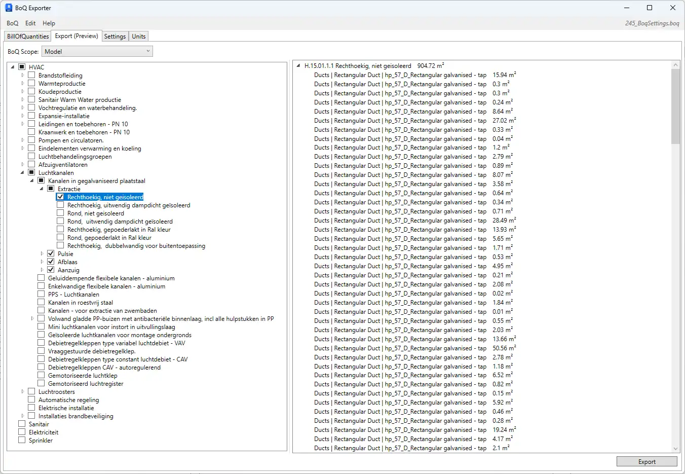 Another key feature of the BoQExport plugin is its Smart Quantification capabilities. This feature automatically calculates lengths, areas, and counts for elements such as ducts, pipes, fittings, and terminals, saving users valuable time and effort. By automating the quantification process, users can quickly generate accurate and detailed BOQs without the need for manual calculations.