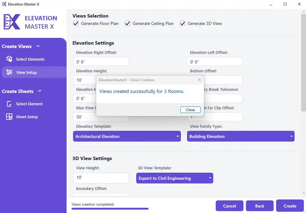 Additionally, ElevationMasterX allows users to define various parameters for the generated views, such as offsets, distance from walls, and boundary offsets for floor and ceiling plans. These customizable options give users full control over the appearance of their views, ensuring that they meet their specific requirements.