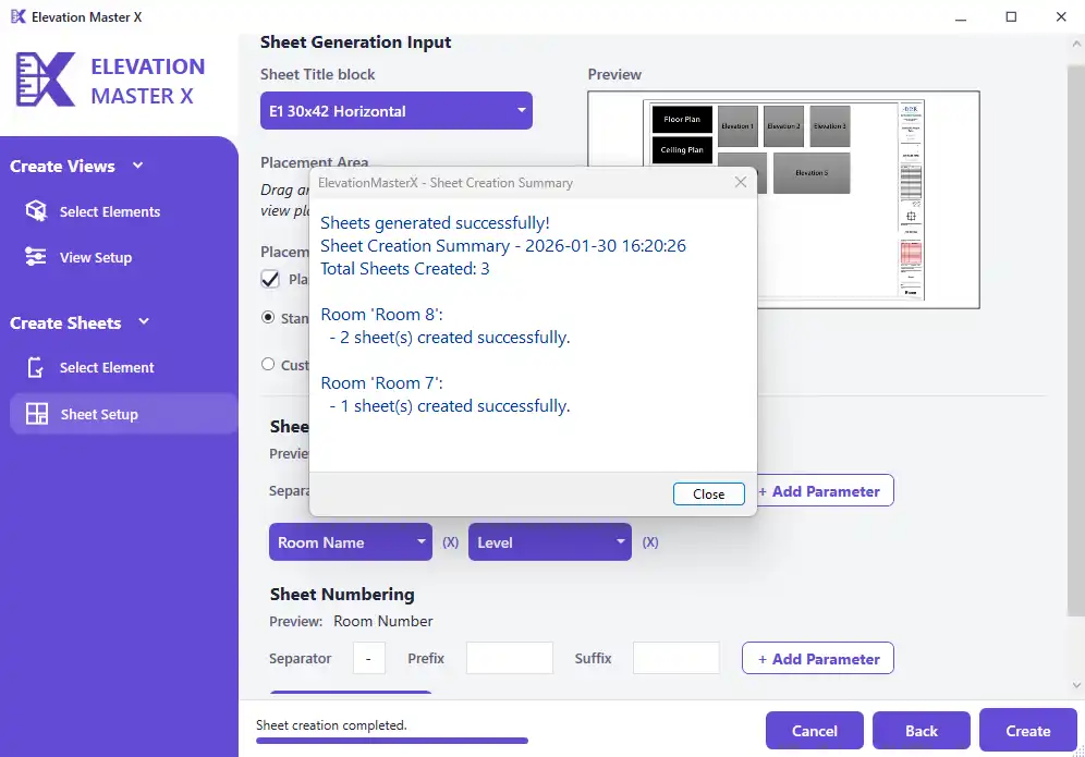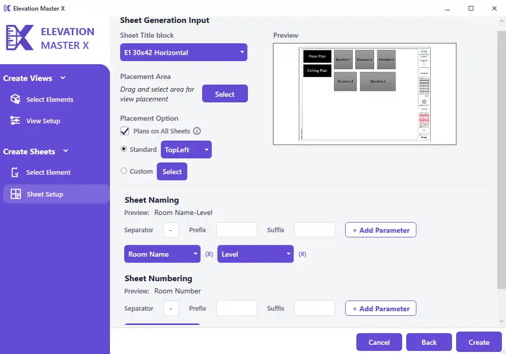 Consistency and clarity are key when it comes to documentation in Revit, and ElevationMasterX makes it easy to maintain these standards. Users can set custom naming conventions for both the generated views and the sheets, ensuring that their documentation is organized and easy to understand.