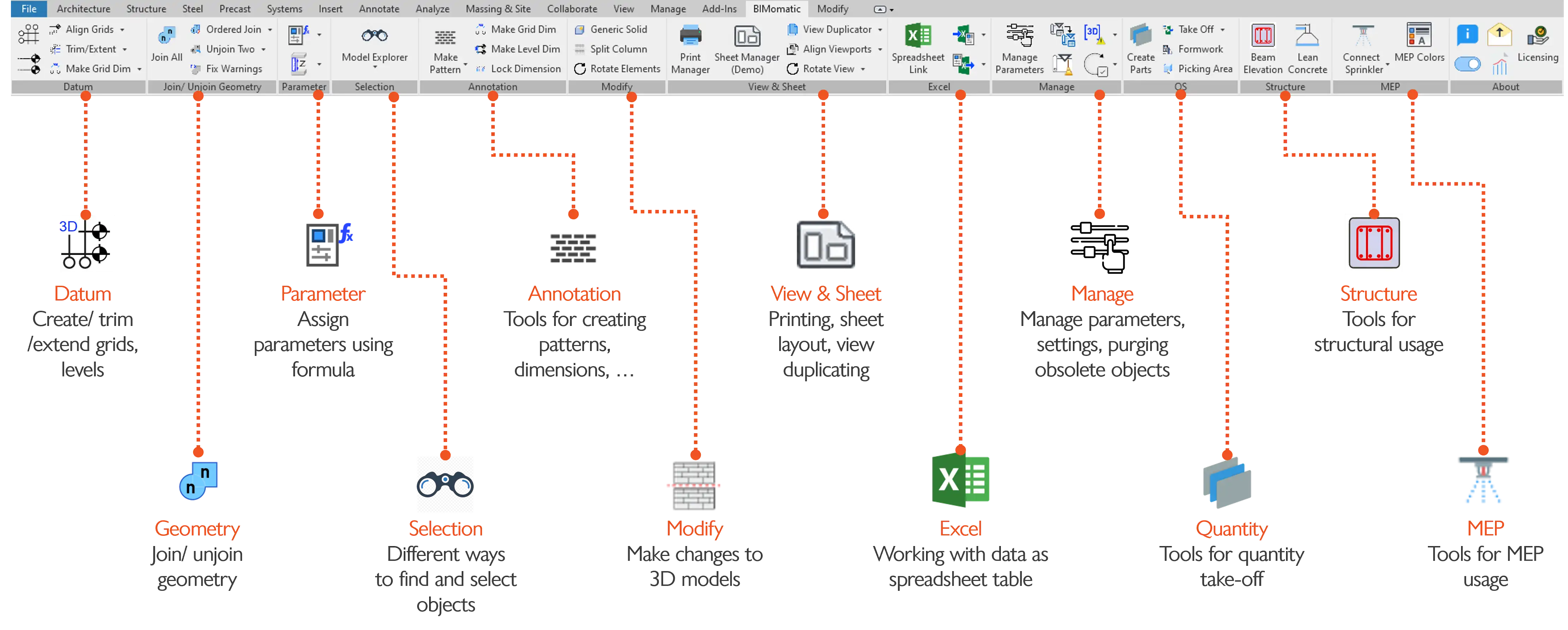 As architects, engineers, and BIM professionals, we are constantly seeking ways to streamline our workflows, reduce errors, and save valuable time. This is where BIMomatic comes in – a powerful Autodesk Revit plugin designed to elevate your Revit experience by offering a wide range of smart tools to help you automate repetitive tasks and enhance standard Revit capabilities.