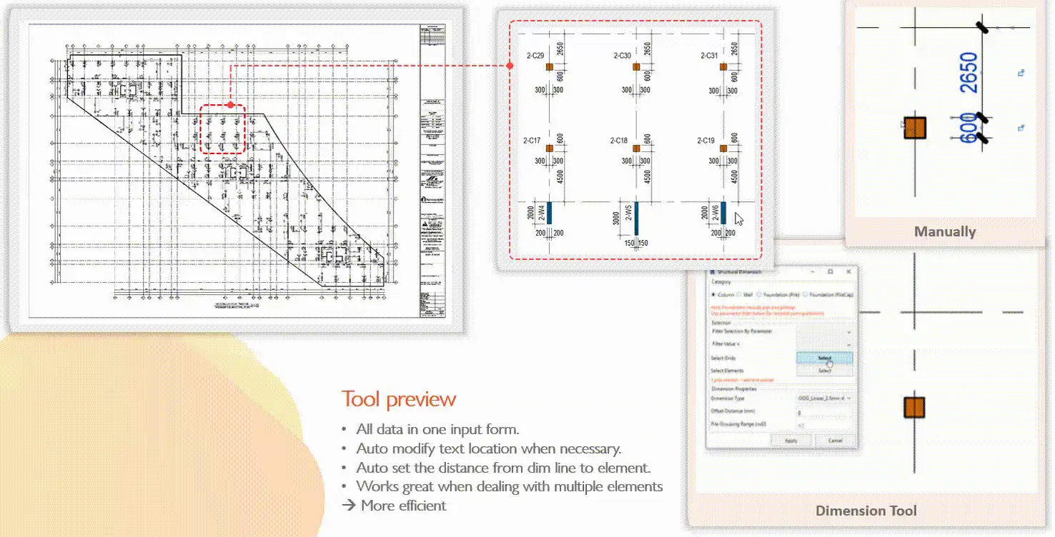 Smart Selection is a handy tool for finding and isolating elements using a tree explorer and rule-based filters. Annotation Tools enable users to auto-generate dimensions for structural elements and create custom fill patterns effortlessly. View & Sheet Tools streamline the process of aligning viewports, duplicating views, and batch creating sheets from Excel.